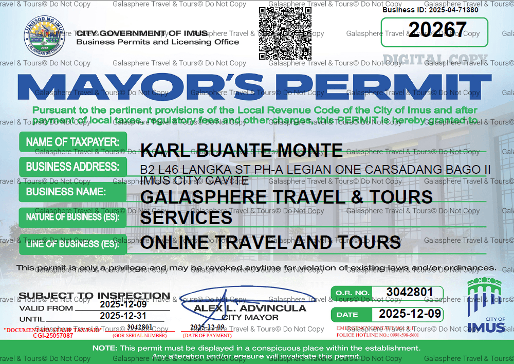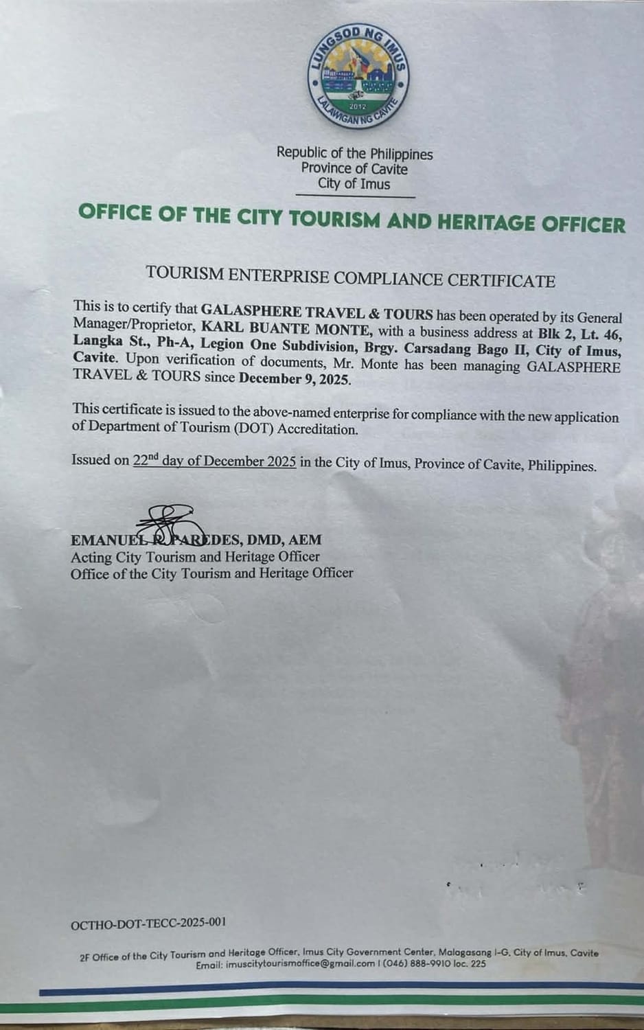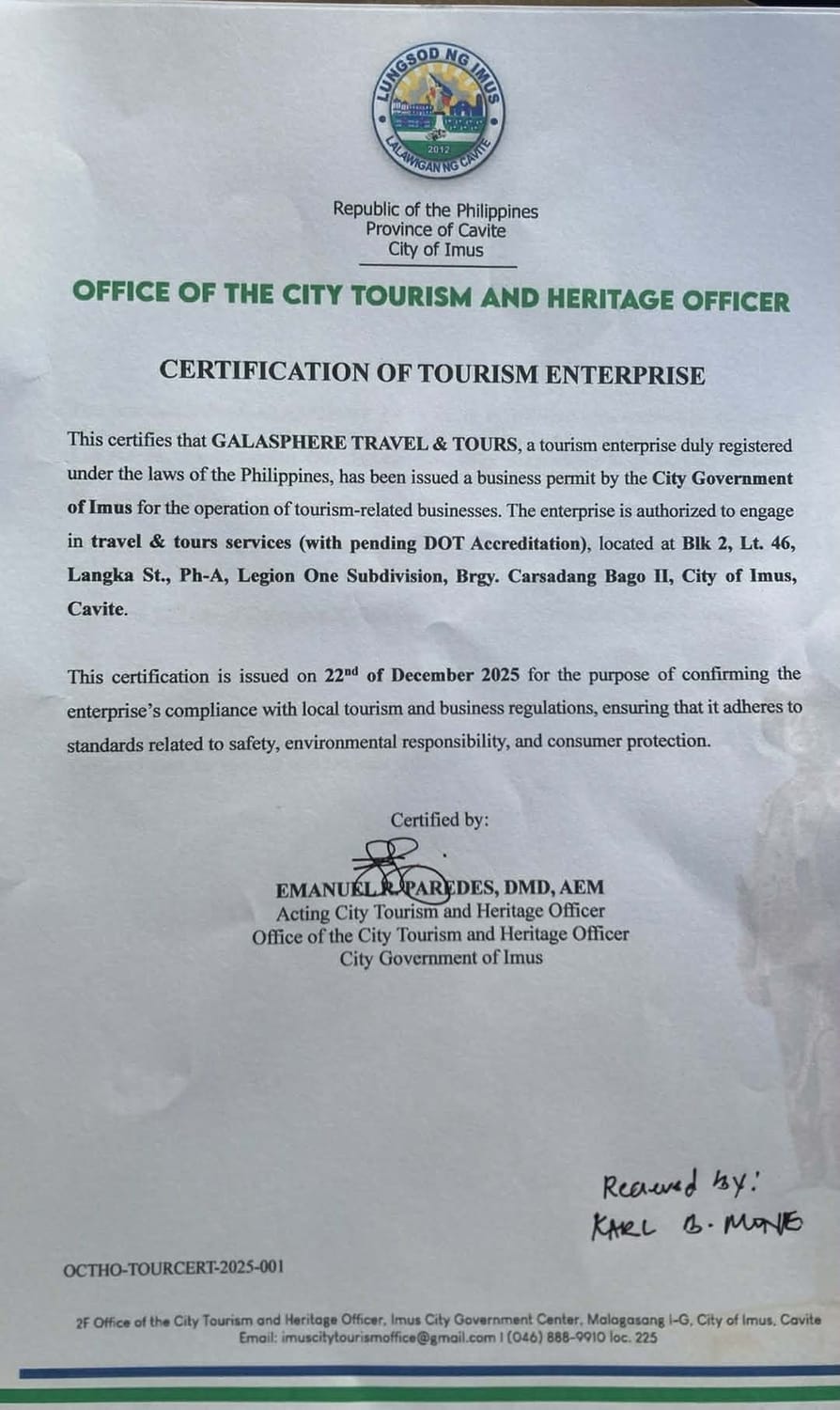 At Galasphere Travel & Tours, we value your trust. We are proud to be a fully registered tourism enterprise, officially certified by the Office of the City Tourism and Heritage Officer of Imus.